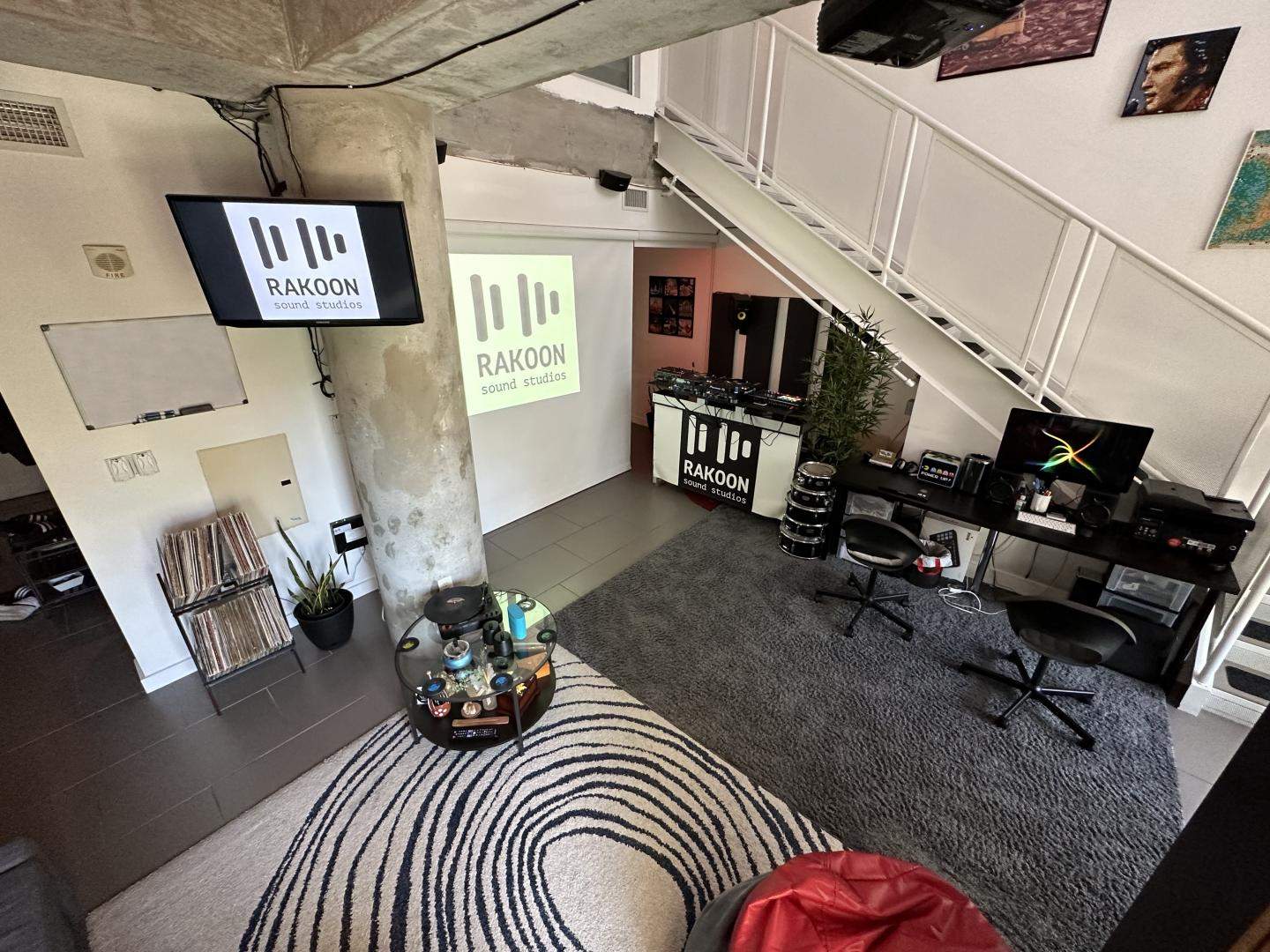 El salón de Rakoon Sound Studios es un lugar ideal para relajarse, comer o tomar un café. Este espacio también cuenta con una cabina de DJ con equipamiento estándar para ensayos, clases y actuaciones.